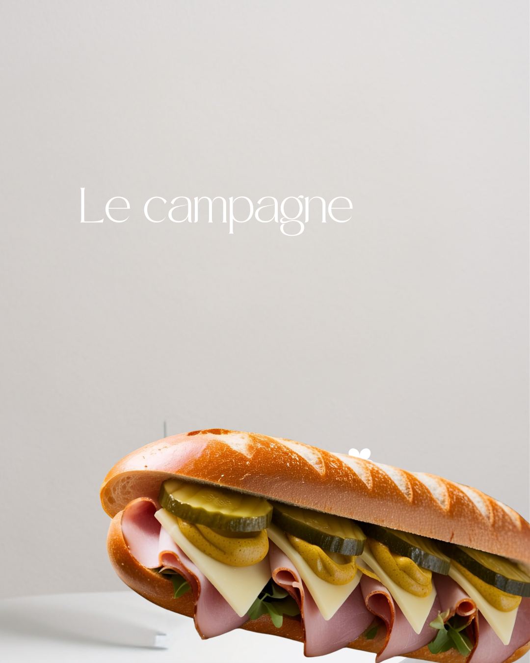 Une baguette tradition, de la moutarde à l'ancienne, du jambon de pays, des cornichons, de la salade et un délicieux comté